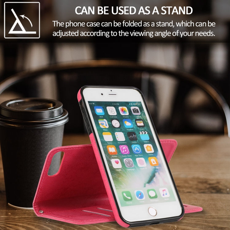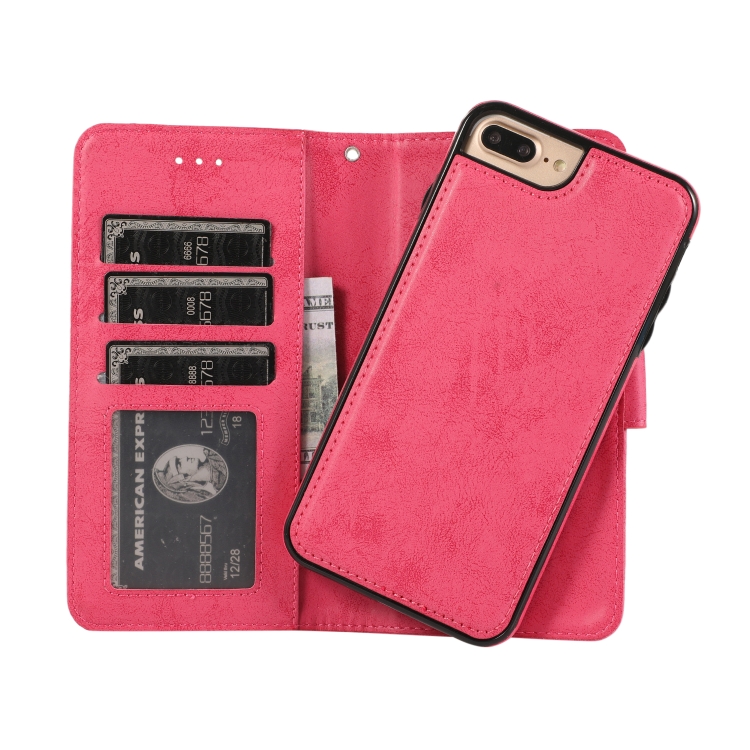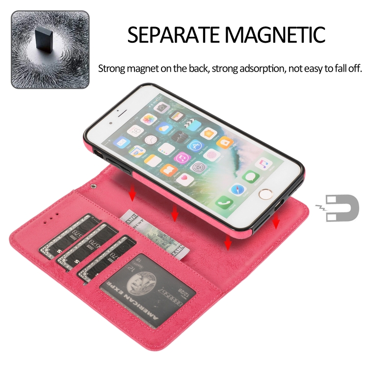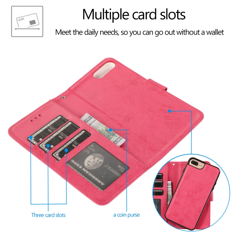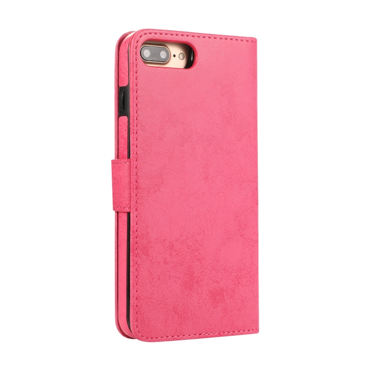 Estuche para iPhone 8 Plus y 7 Plus Klt888-2 2 en 1 Cuero TPU y PU Tapa Horizontal Magnética Soporte Ranuras para Tarjetas Marco de Fotos Billetera (Rosa Roja)