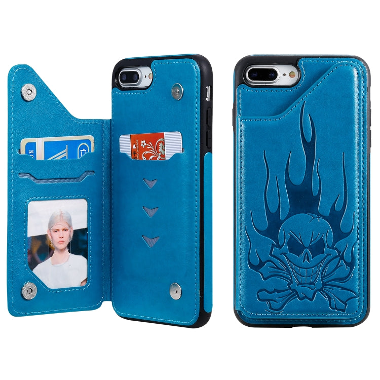 Pour iPhone 8 Plus / 7 Plus Étui de protection antichoc à motif en relief avec tête de crâne avec support, fentes pour cartes et portefeuille (bleu)