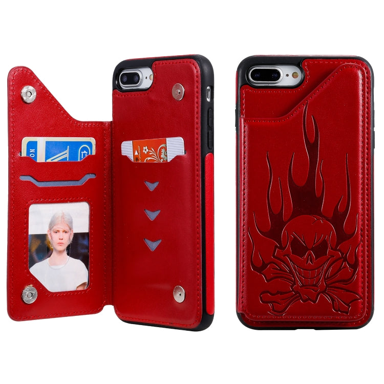 Pour iPhone 8 Plus / 7 Plus Étui de protection antichoc à motif en relief avec tête de crâne avec support, fentes pour cartes et portefeuille (rouge)