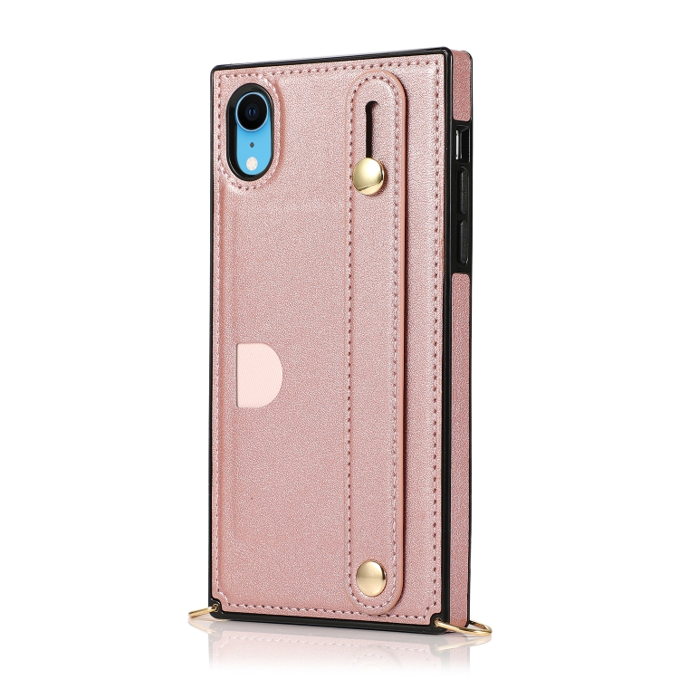 Correa de Muñeca Pu para iPhone Xr + Funda TPU Protectora a Prueba de Golpes con Soporte y Ranura para Tarjeta (Oro Rosa)