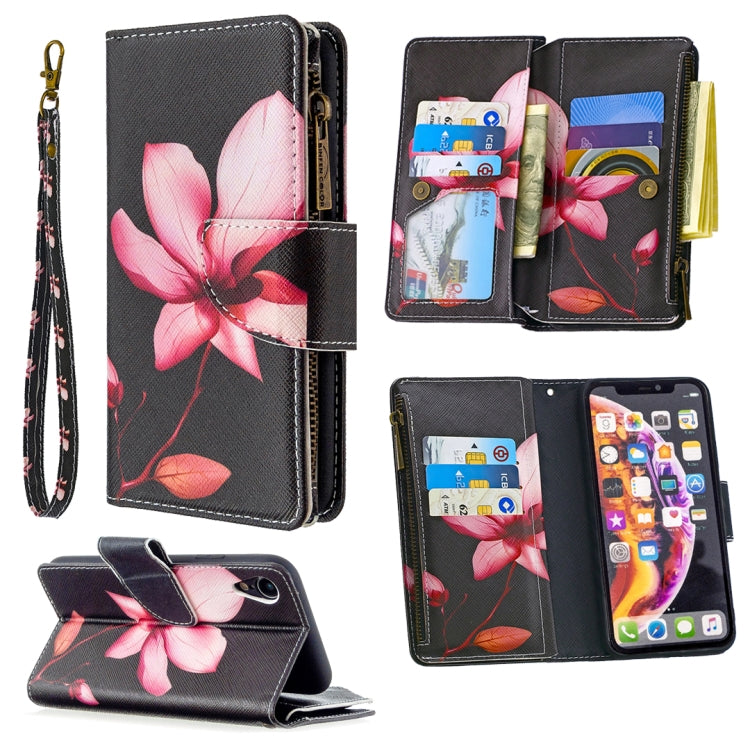 Funda de Cuero iPhone Xr Patrón Dibujo a Color Cremallera Tapa Horizontal Soporte Ranuras Tarjetas Billetera (Lotus)
