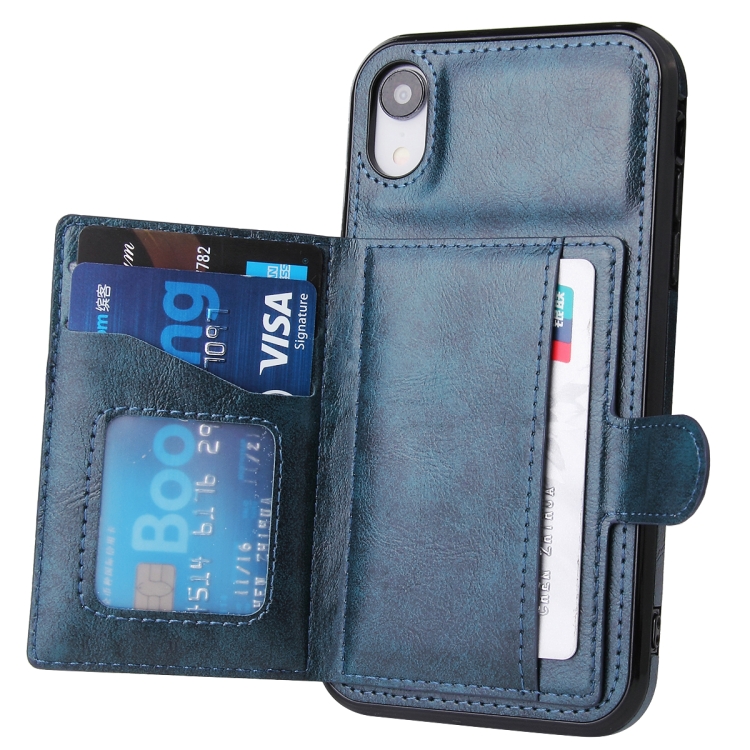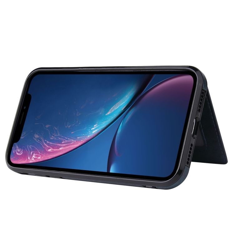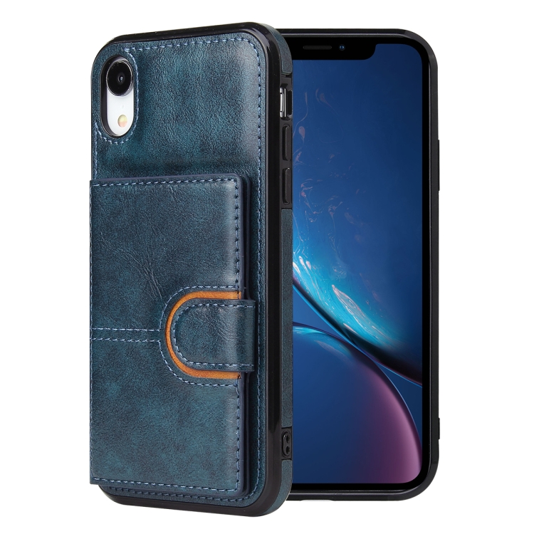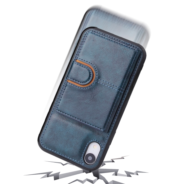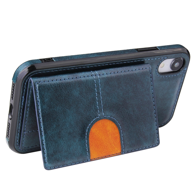 Funda Trasera para iPhone Xr Pu + TPU + PC a Prueba de Golpes con Ranura para Tarjeta y Soporte (Azul)