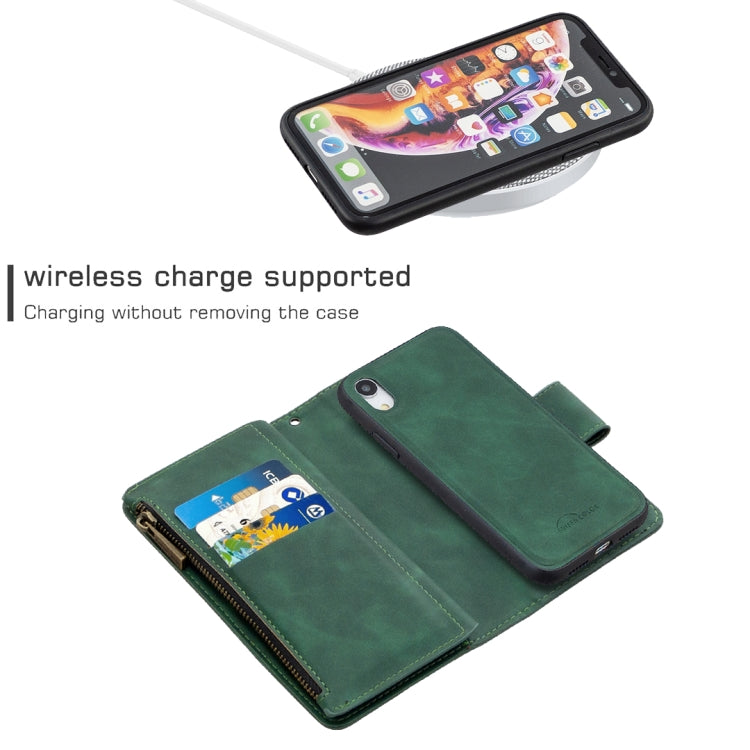 Funda para iPhone Xr Skin Feel Desmontable Cremallera Magnética Cuero PU Tapa Horizontal Ranuras Tarjetas Soporte Billetera Marco Fotos Cordón (Verde)