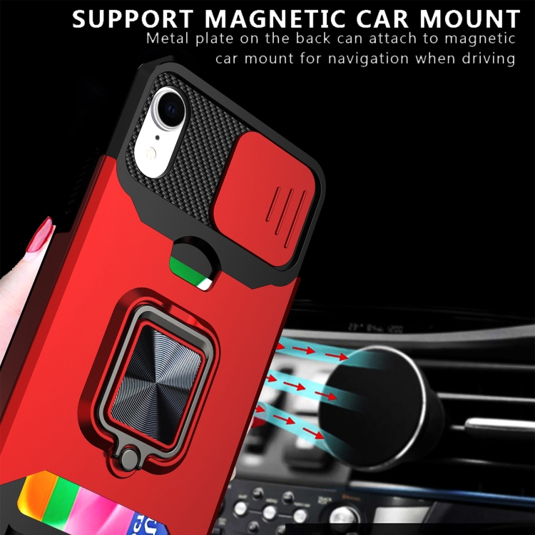 Funda para iPhone Xr Sliding Camshield Ranura para Tarjeta Anillo Kickstand (Plata)