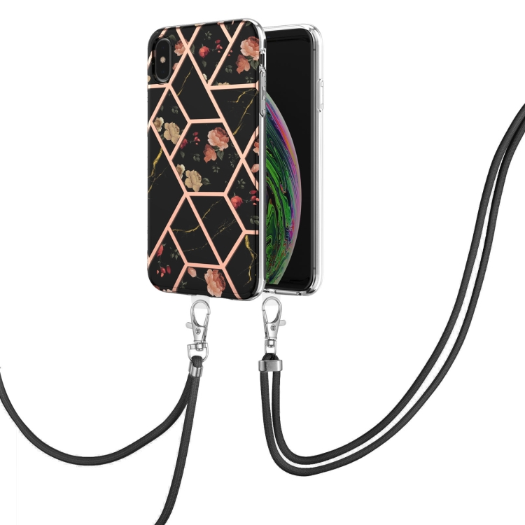 Estuche TPU para iPhone Xs Max Galvanoplastia Empalme Mármol Patrón de Flores a Prueba de Golpes con Cordón (Flor Negra)