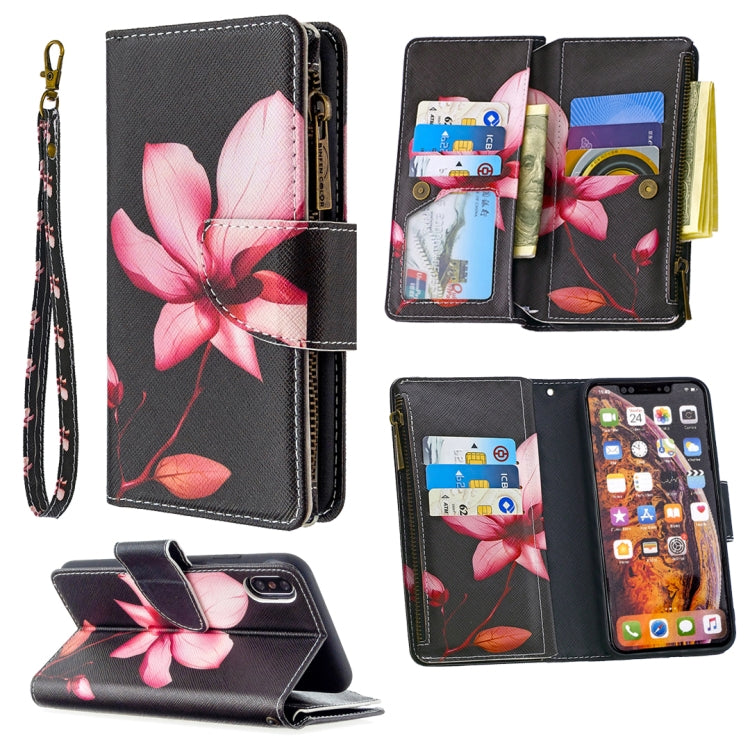 Funda de cuero para iPhone Xs Max con patrón de dibujo, cremallera, tapa horizontal, soporte y ranuras para tarjetas (Lotus)