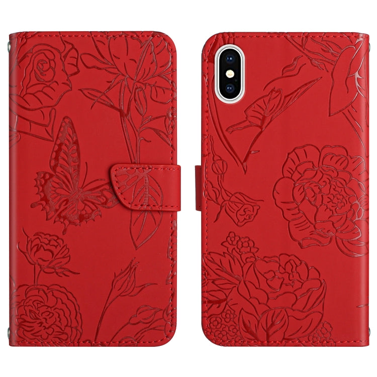 Pour iPhone XS Max Skin Feel Étui de téléphone en cuir gaufré pivoine papillon (rouge)