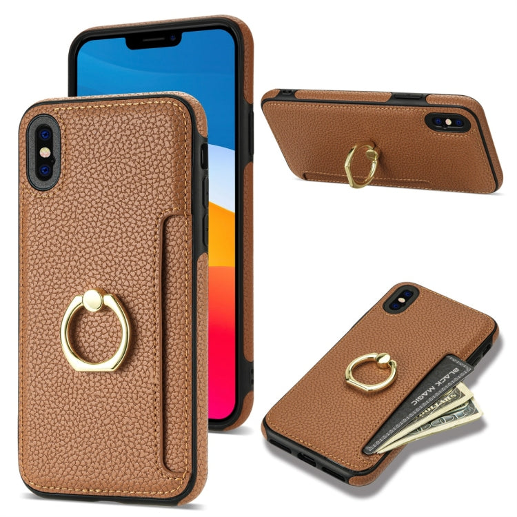 Funda Trasera para iPhone Xs X Ring Card Litchi Cuero (Marrón)