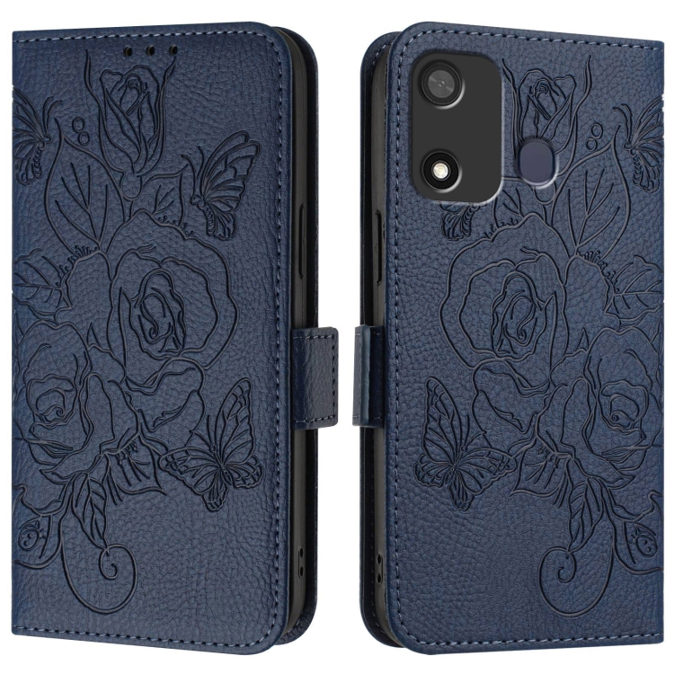 Estuche para Itel A27 de Cuero Antirrobo RFID con Rosa en Relieve (Azul Oscuro)