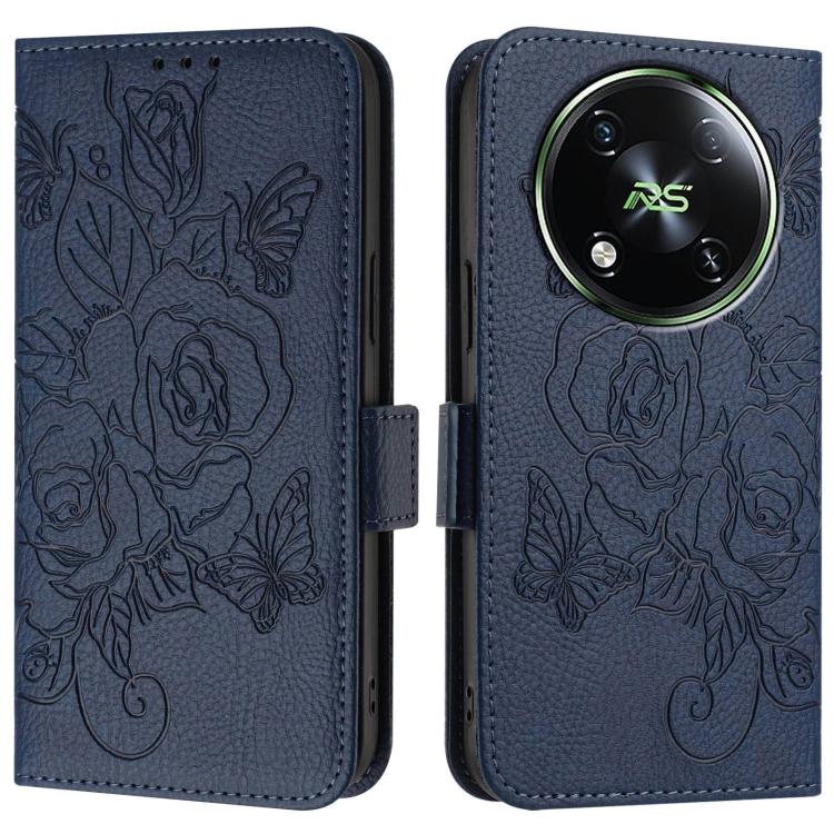 Estuche para Teléfono Itel Rs4 de Cuero Antirrobo RFID con Rosa en Relieve (Azul Oscuro)