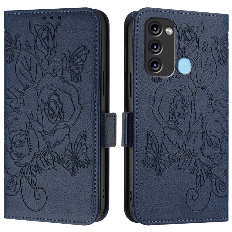 Funda para Itel S17 y Vision 3 de Cuero Antirrobo RFID con Rosa en Relieve (Azul Oscuro)