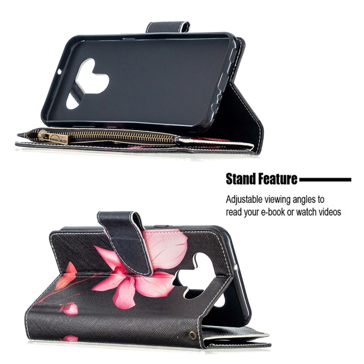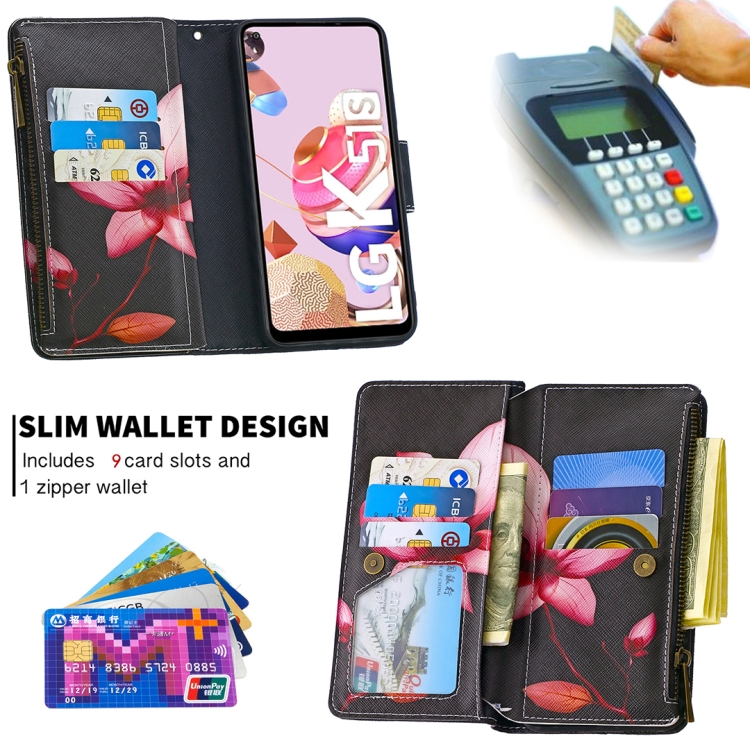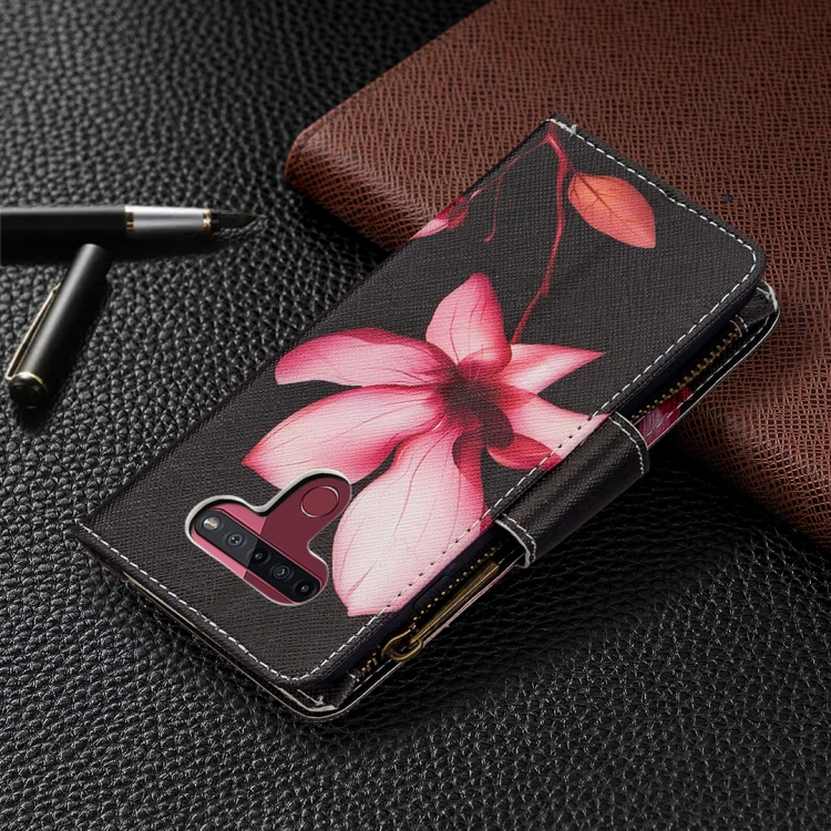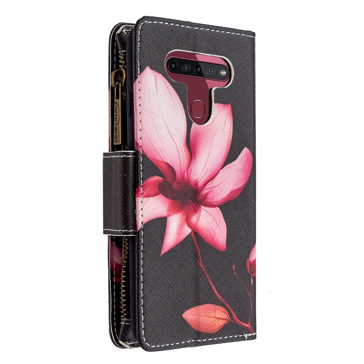 Funda de Cuero para LG K51 con Patrón de Dibujo, Cremallera, Tapa Horizontal, Soporte y Billetera (Lotus)