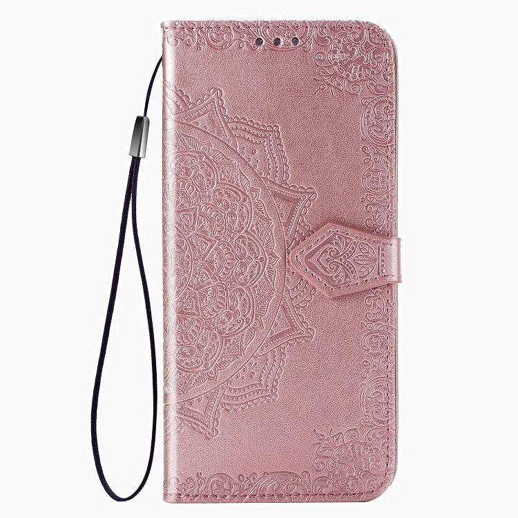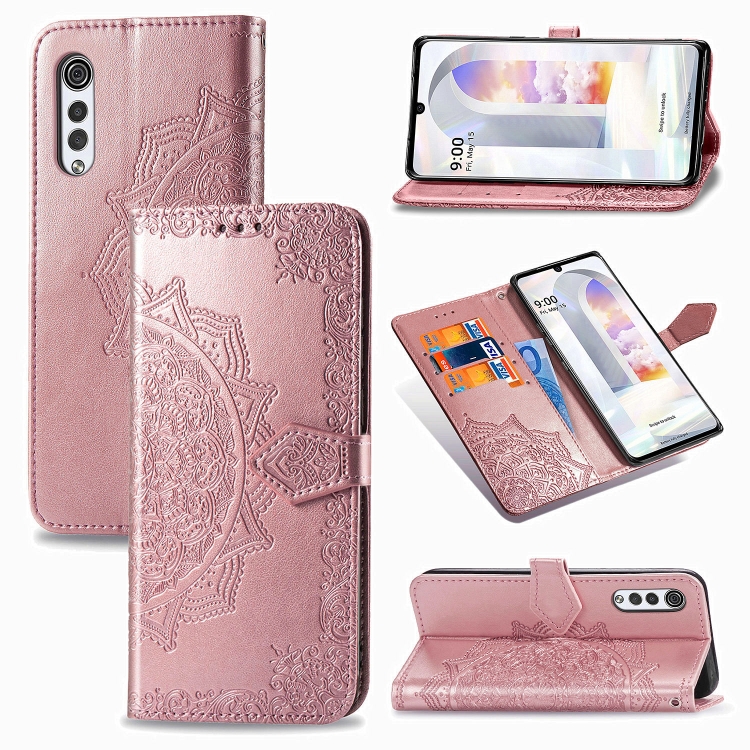 Funda de Cuero LG Velvet 5G Mandala Flower con Tapa Horizontal, Soporte, Ranura para Tarjeta, Billetera y Cordón (Oro Rosa)