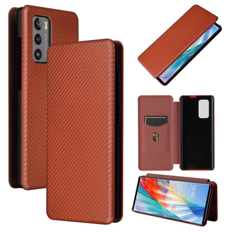 Carcasa para LG Wing 5G de Cuero con Textura Fibra de Carbono, Tapa Horizontal y Ranura para Tarjeta (Marrón)