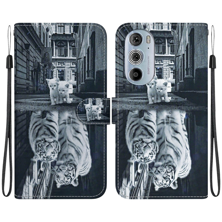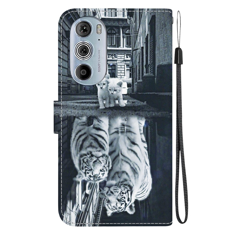 Estuche de Cuero para Motorola Edge + (2022) con Dibujo Coloreado y Textura de Cristal (Reflejo de Tigre Gato)