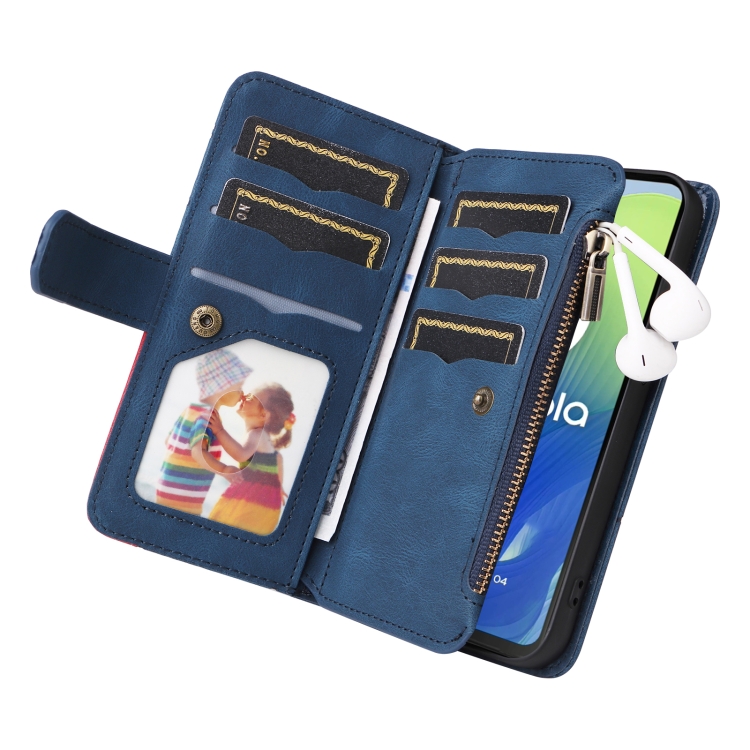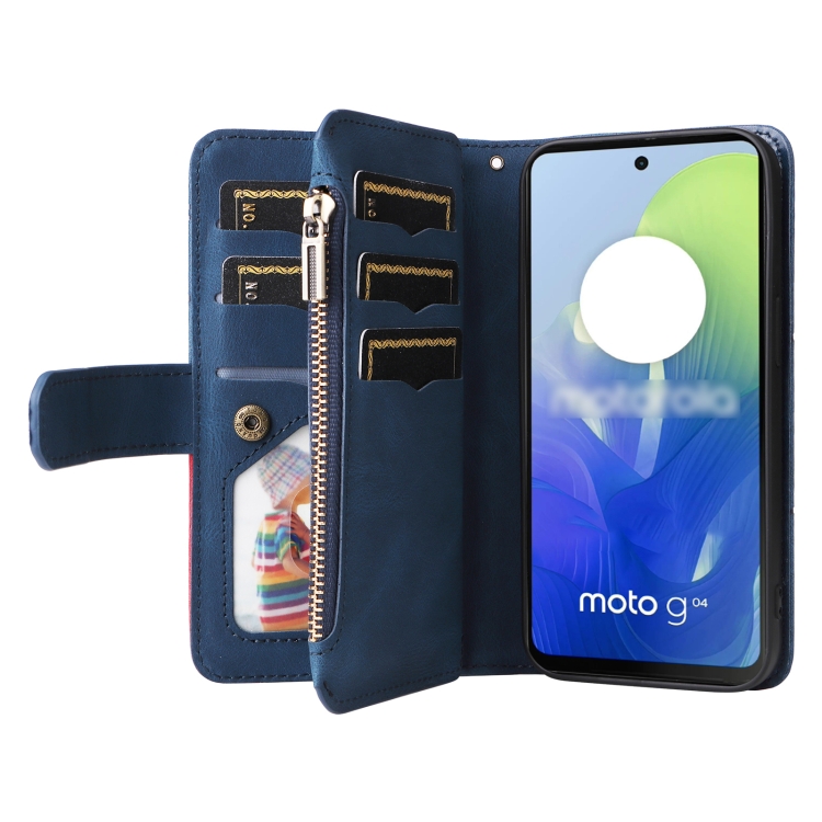 Funda para Motorola Moto G04 / G24 de Cuero con Billetera, Cremallera y 9 Ranuras para Tarjetas (Azul)