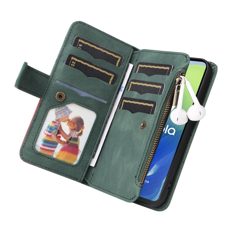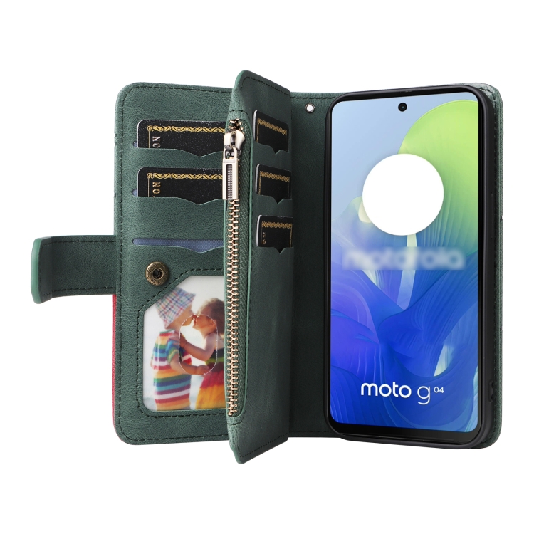 Funda de Cuero para Motorola Moto G04 / G24 con Billetera, Cremallera y 9 Ranuras para Tarjetas (Verde)