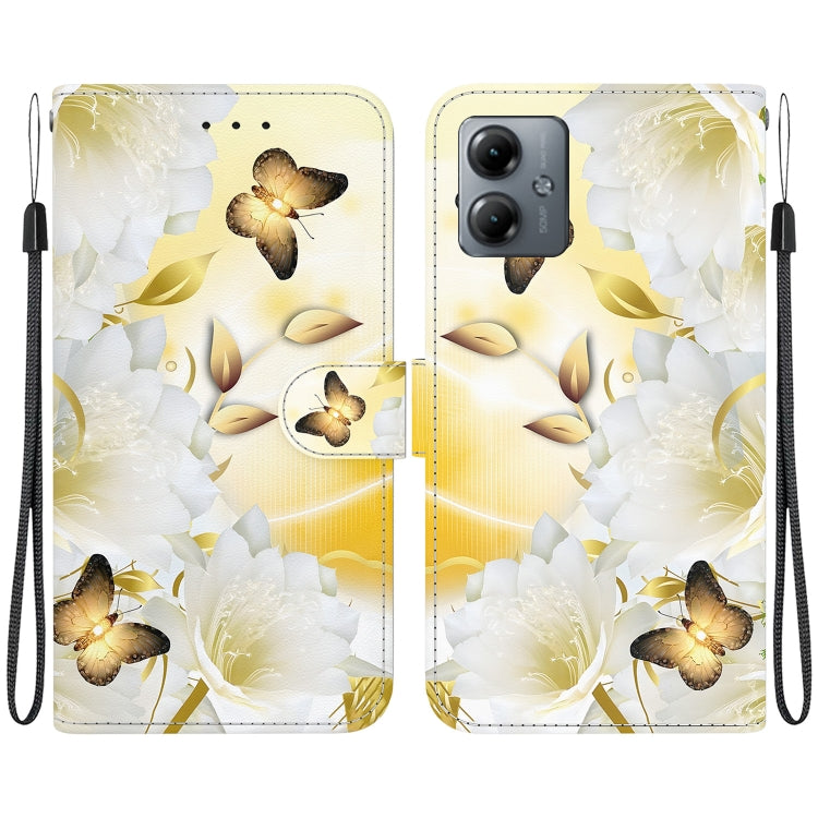 Funda de Cuero para Motorola Moto G14 con Dibujo Epiphyllum de Mariposa Dorada y Textura de Cristal