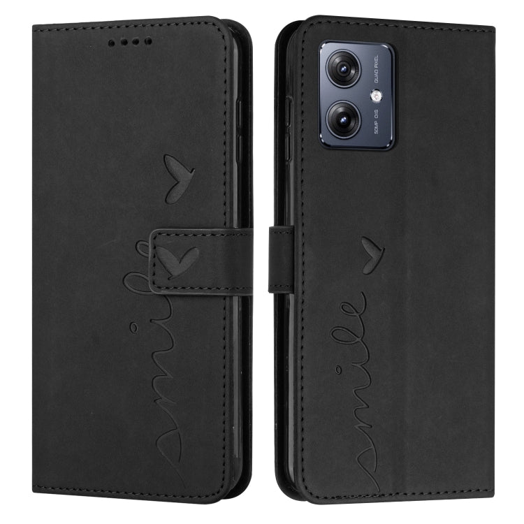 Funda de Cuero para Motorola Moto G54 Skin Feel Heart con Relieve y Cordón Largo (Negro)
