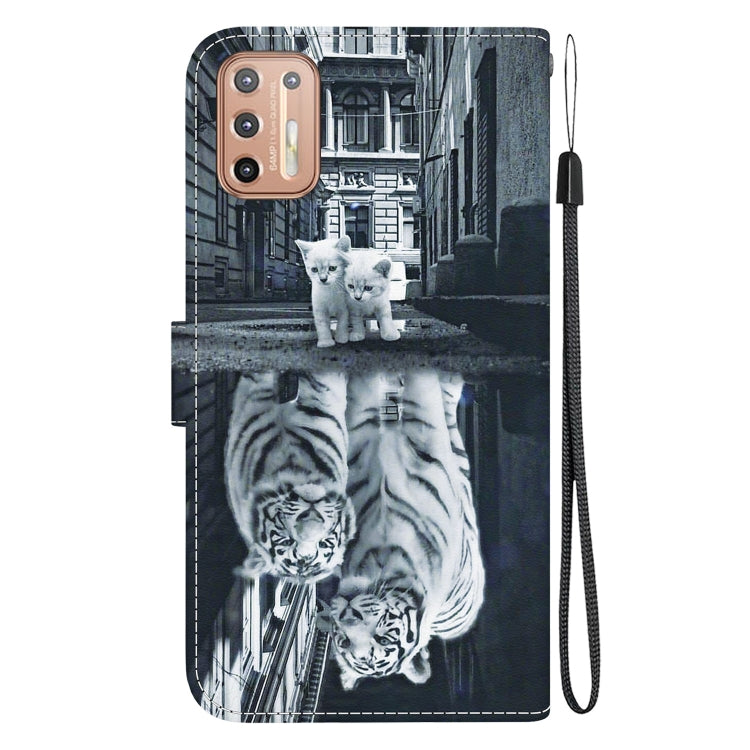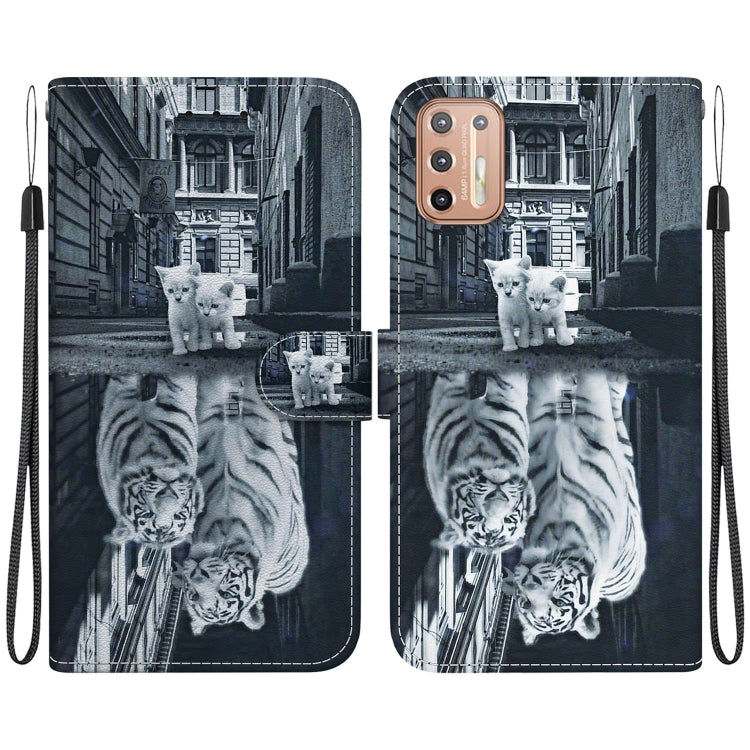 Funda de Cuero para Motorola Moto G9 Plus con Dibujo Coloreado y Textura de Cristal (Reflejo de Tigre Gato)