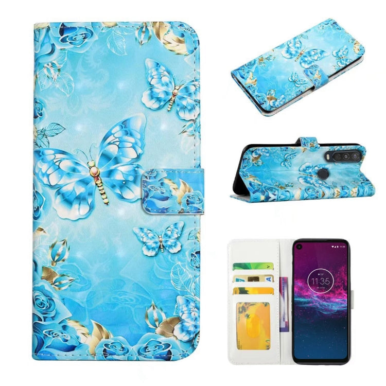 Funda de Cuero para Motorola One Action con Dibujo 3D en Relieve al Óleo (Mariposas Azules)