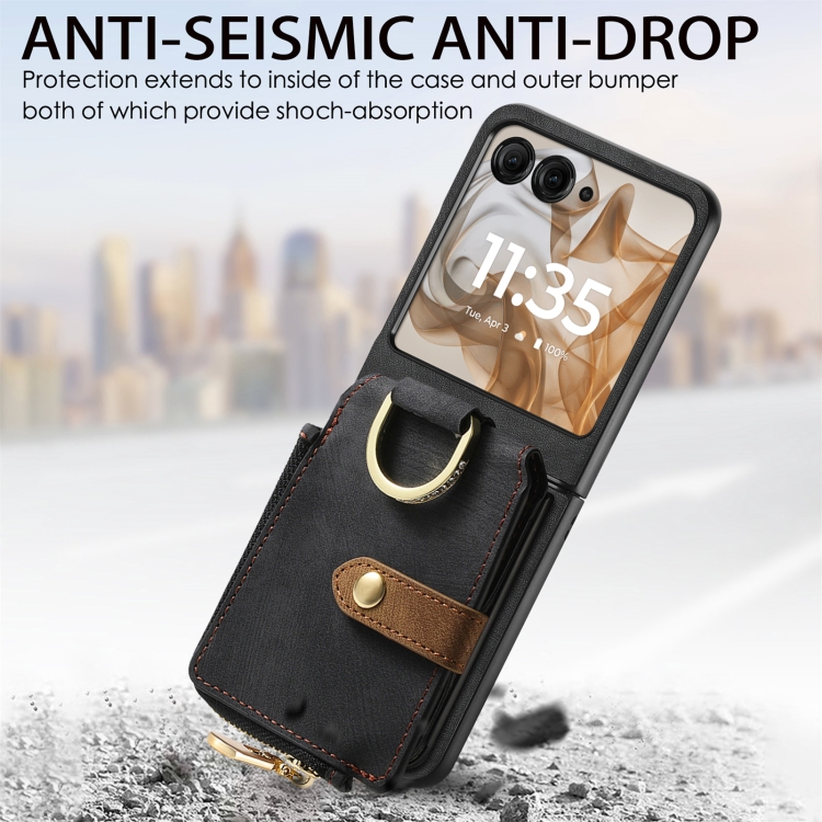 Estuche para Motorola Razr 50 con Billetera, Cremallera Vertical y Anillo Retro (Negro)