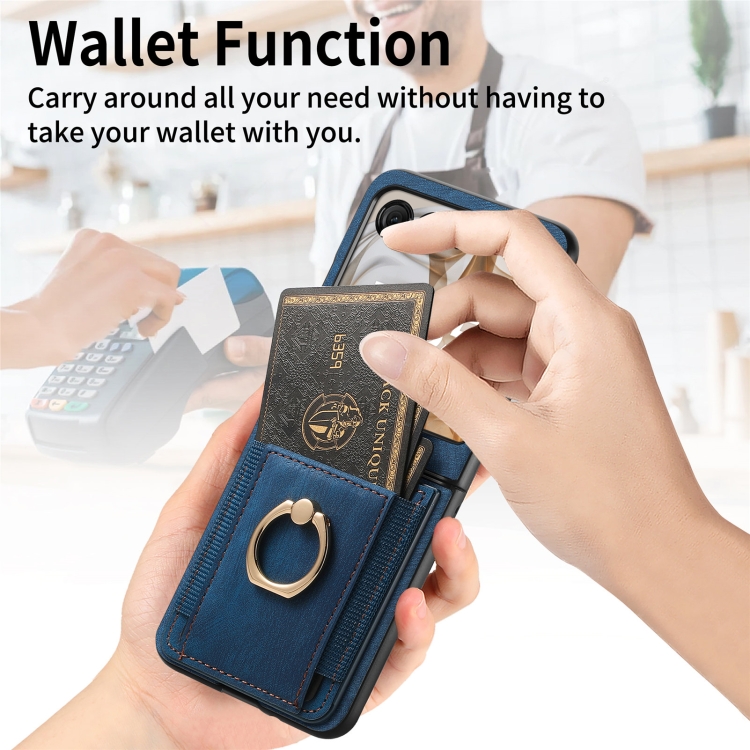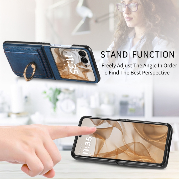 Funda para Motorola Razr 50 con Bolsa para Tarjeta y Anillo Sensación de Piel Retro (Azul)