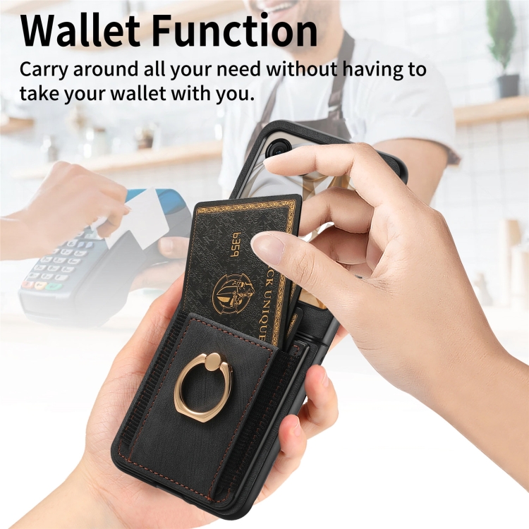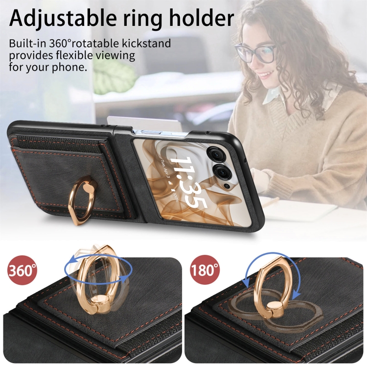 Funda para Motorola Razr 50 con Bolsa para Tarjeta y Anillo Sensación de Piel Retro (Negro)