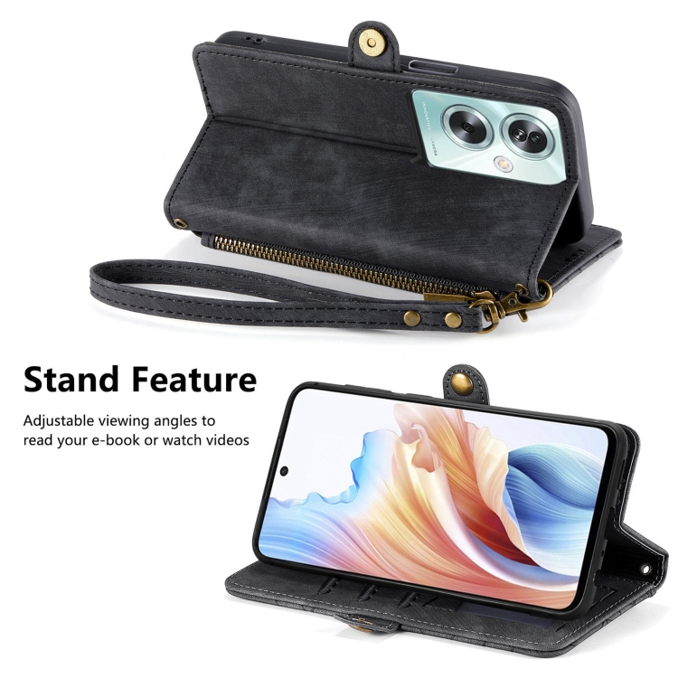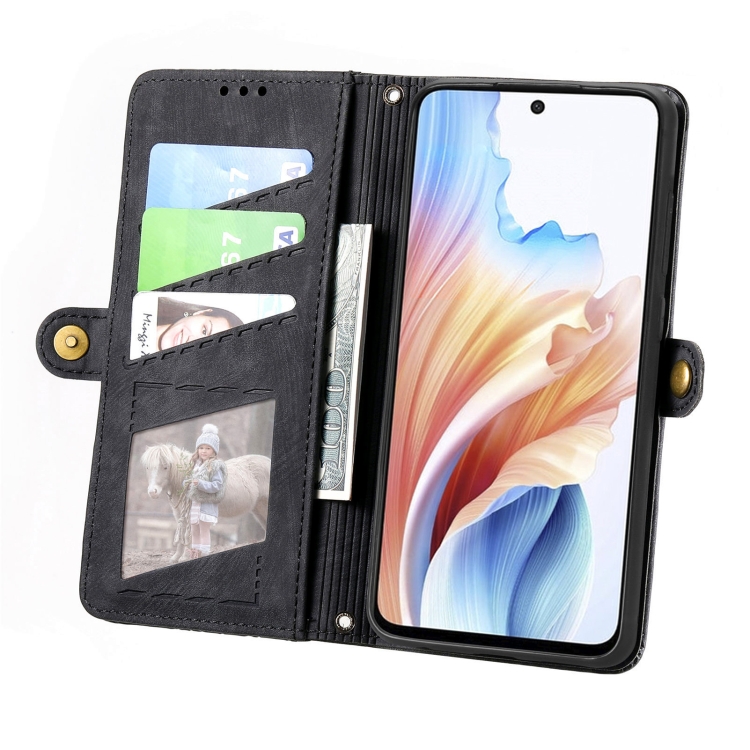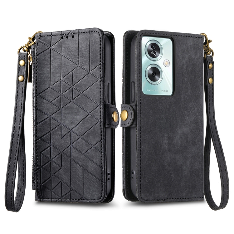 Para Oppo A79 5G / A2 5G Funda de Teléfono de Cuero con Hebilla Lateral y Billetera con Cremallera Geométrica (Negro)