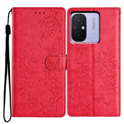 Para Redmi 12C Funda de Cuero para Teléfono con Mariposas y Flores (Rojo)