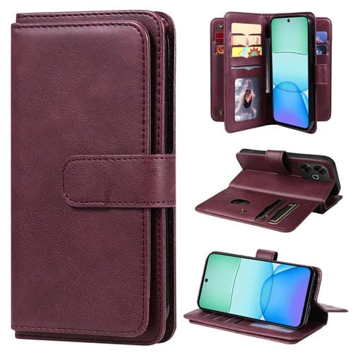 Para Redmi 13 4G Cartera Multifunción Global 10 Ranuras para Tarjetas Funda de Cuero para Teléfono (Clarete)