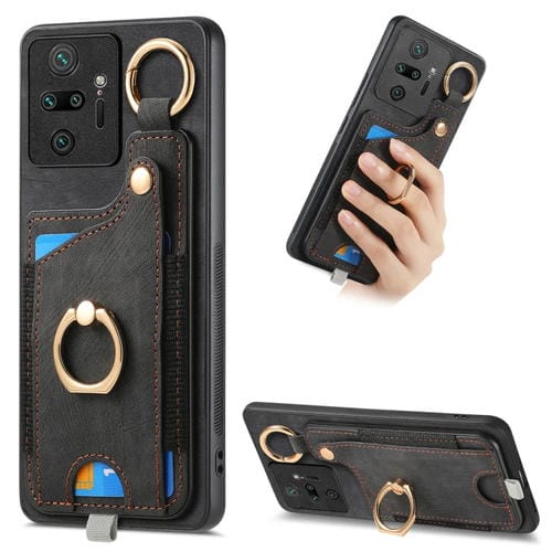 Para Redmi Note 10 Pro 4G Funda para Teléfono con Bolsa para Tarjeta con Anillo y Sensación de Piel Retro con Lazo para Colgar (Negro)