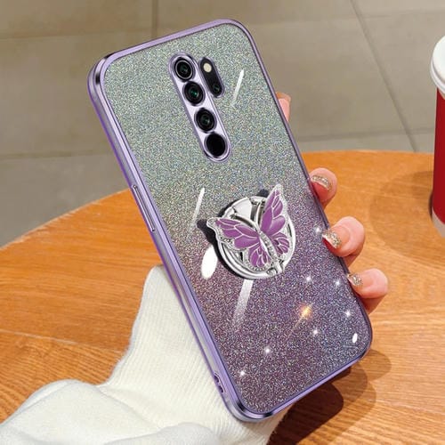 Para Redmi Note 8 Pro Funda para Teléfono de TPU con Soporte de Mariposa con Brillo Degradado Plateado (Púrpura)