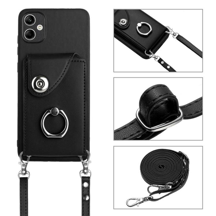 Funda para Teléfono Samsung Galaxy A04 4G con Soporte para Anillo y Bolsa para Tarjeta con Cordón Largo (Negro)