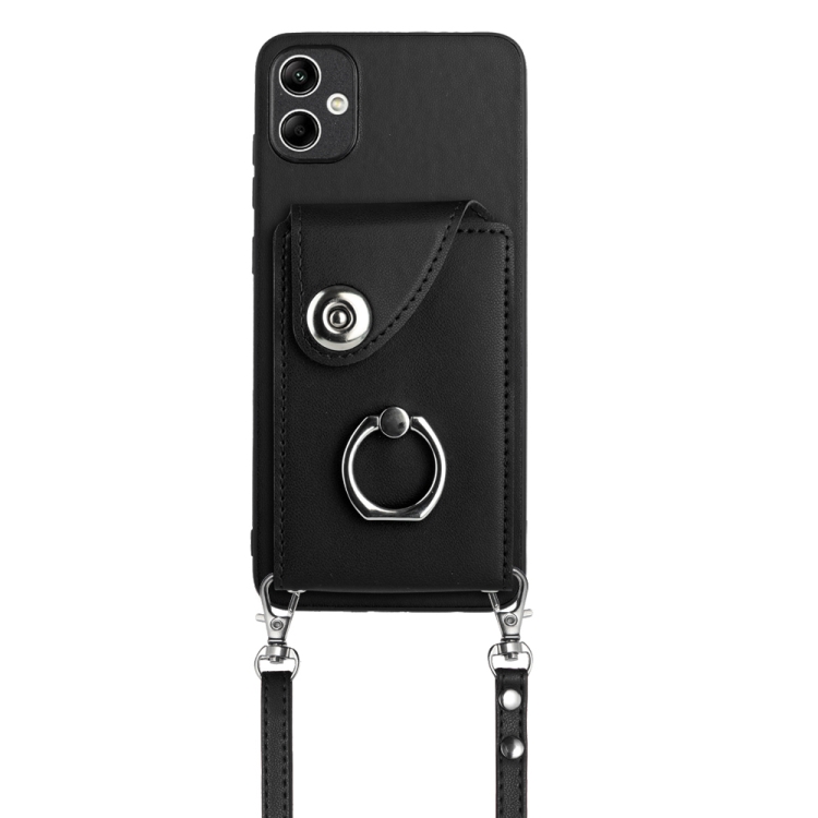 Funda para Teléfono Samsung Galaxy A04E M04 F04 4G con Soporte para Anillo y Bolsa para Tarjeta con Cordón Largo (Negro)