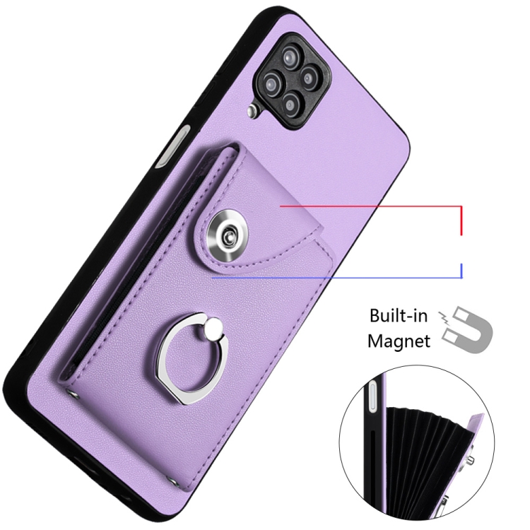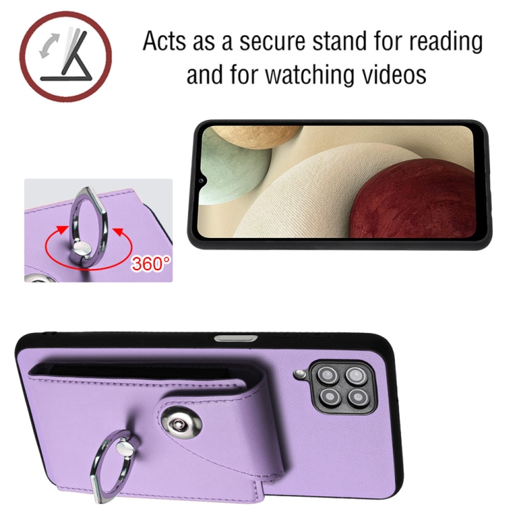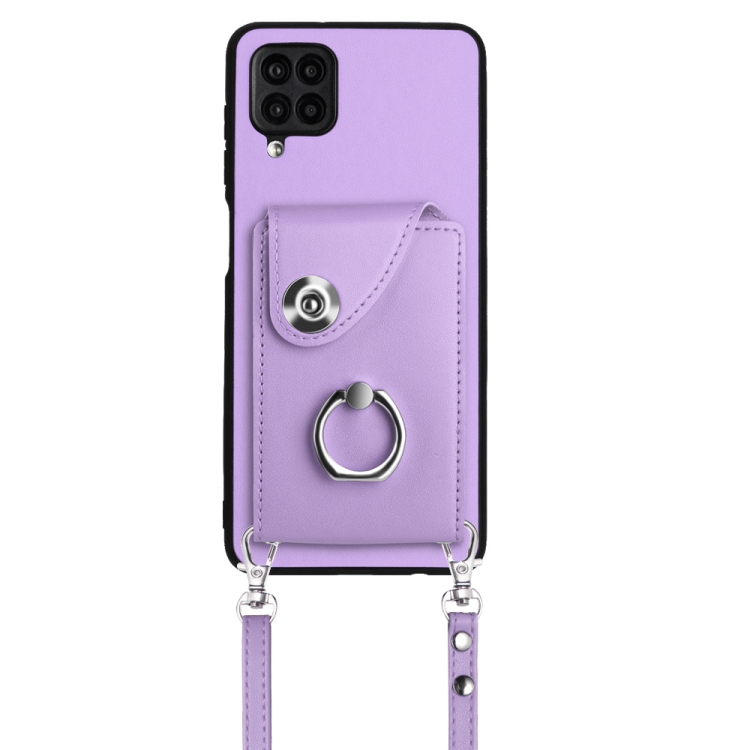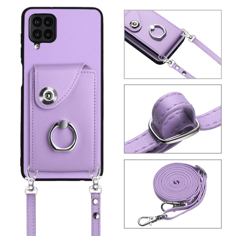 Funda para Teléfono Samsung Galaxy A12 con Soporte para Anillo y Bolsa para Tarjeta con Cordón Largo (Púrpura)