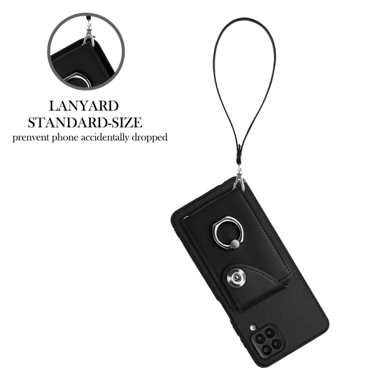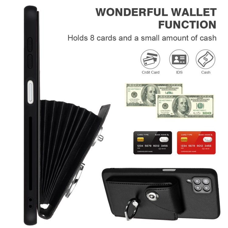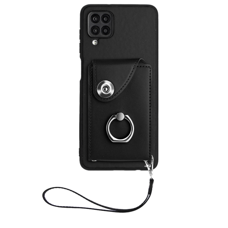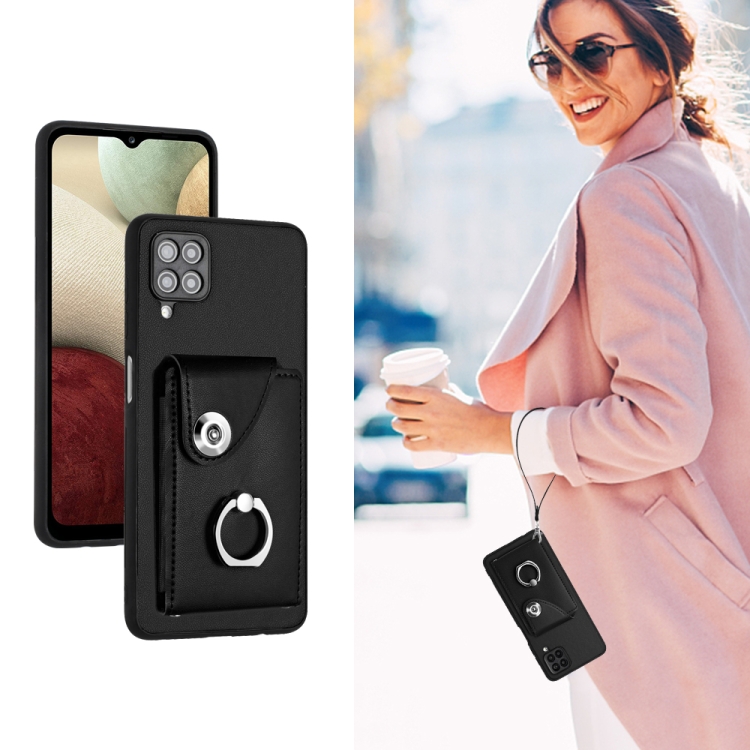 Funda para Teléfono Samsung Galaxy A12 de PU con Soporte para Anillo y Bolsa para Tarjeta con Cordón (Negro)