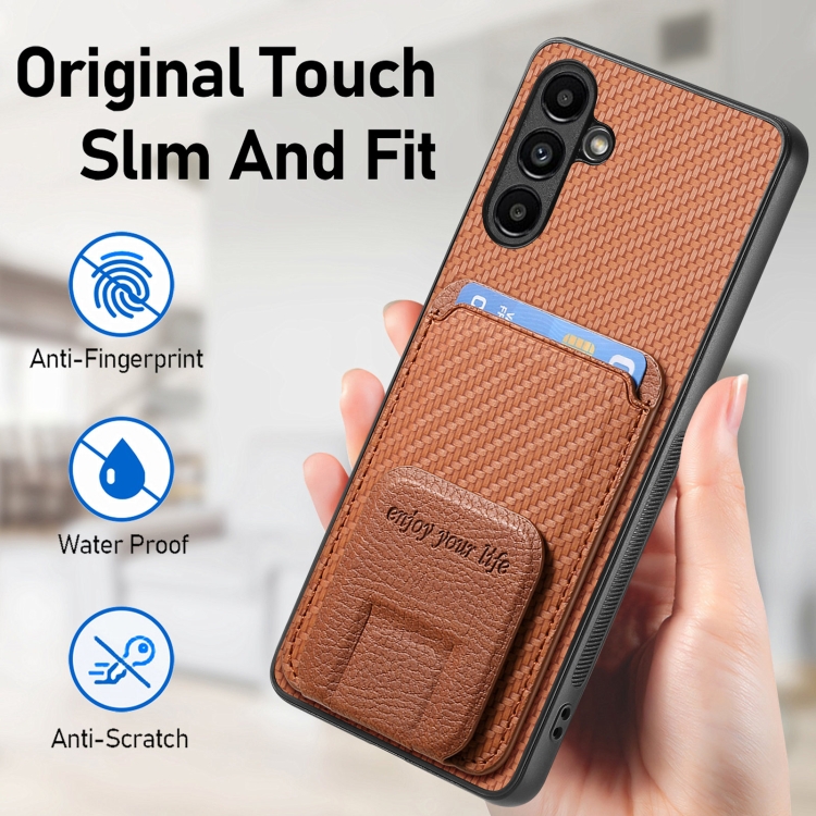 Funda para Teléfono Samsung Galaxy A14 4G / 5G con Soporte Plegable y Bolsa para Tarjetas de Fibra de Carbono (Marrón)
