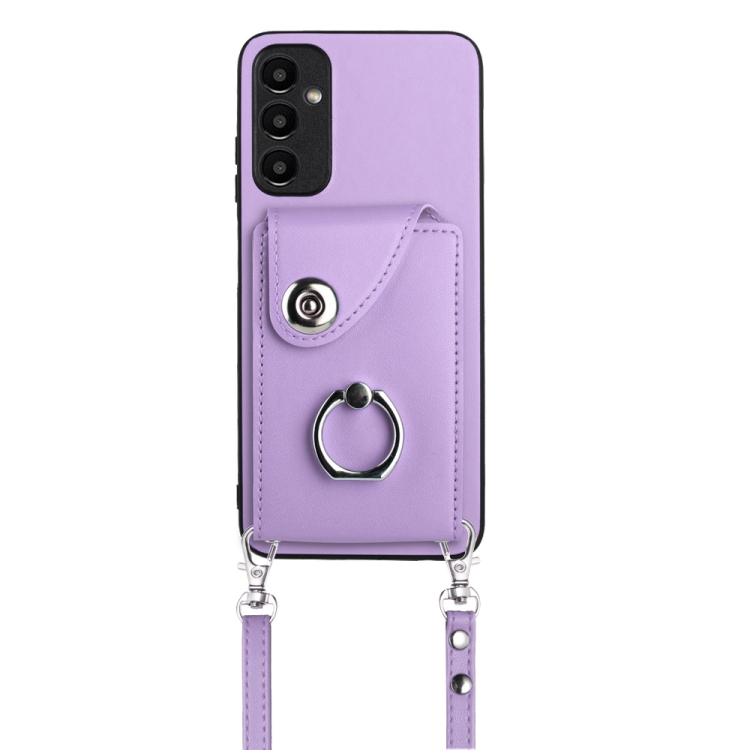 Funda para teléfono Samsung Galaxy A15 4G con soporte para anillo y bolsa para tarjeta con cordón largo (Púrpura)