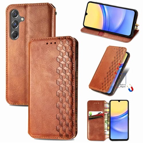 Funda para Teléfono Samsung Galaxy A15 Cuero Magnético Prensado Rejilla Cúbica (Marrón)