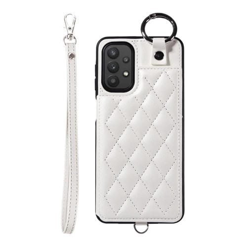 Estuche para Teléfono Samsung Galaxy A32 5G con Bolsa para Tarjetas Textura Rómbica y Cordón Corto (Blanco)