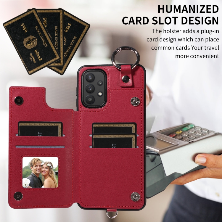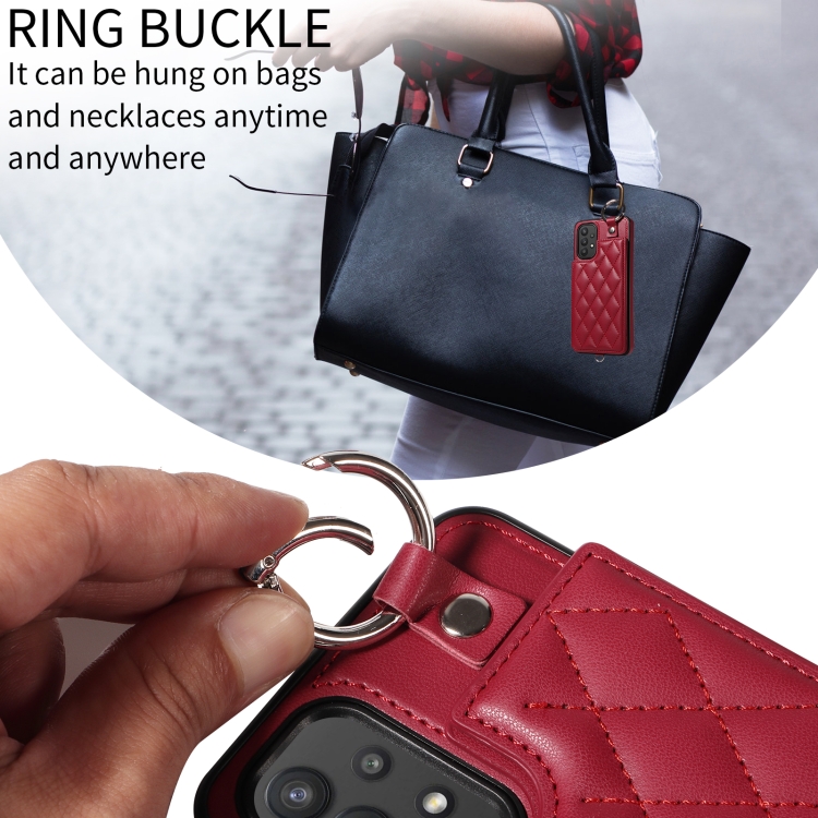 Estuche para Teléfono Samsung Galaxy A32 5G con Bolsa para Tarjetas Textura Rómbica y Cordón Corto (Rojo Vino)