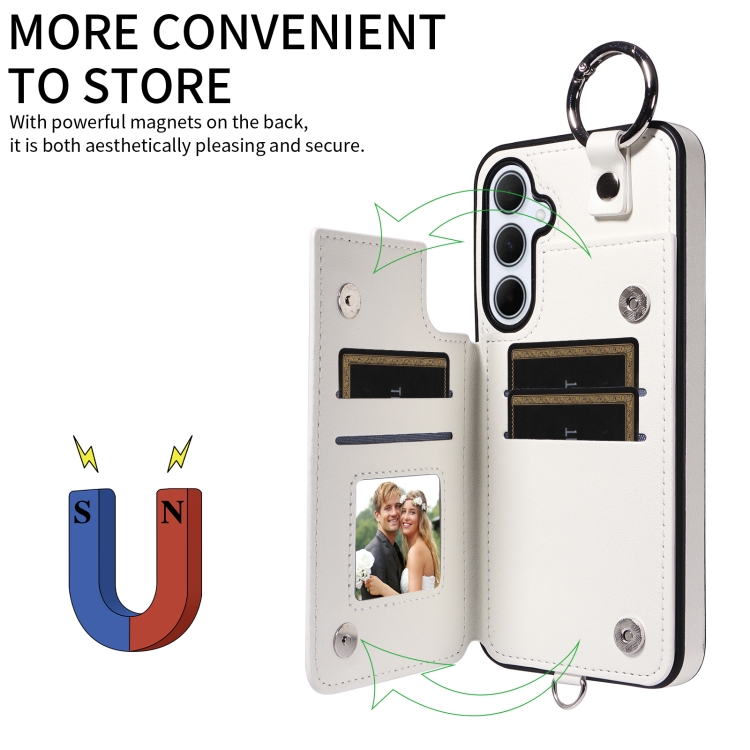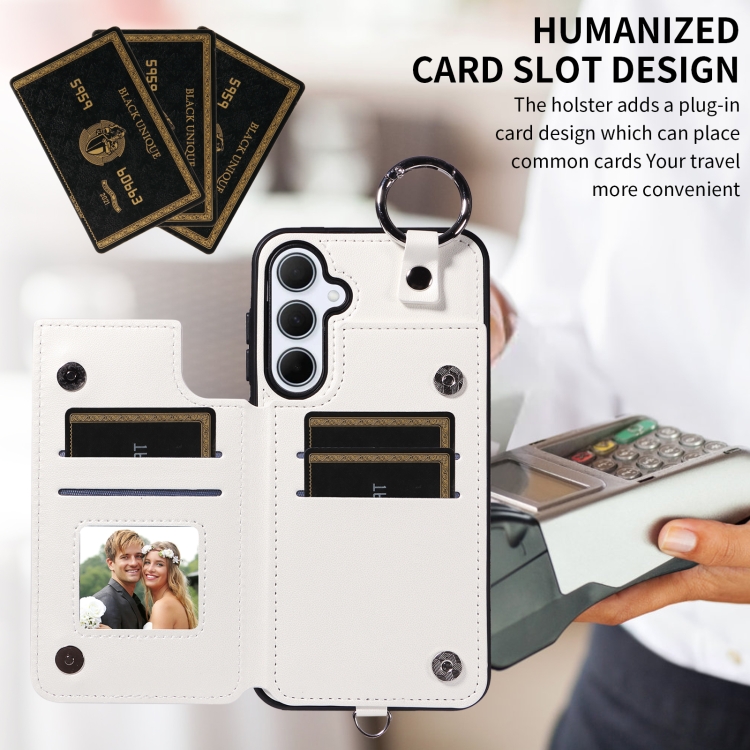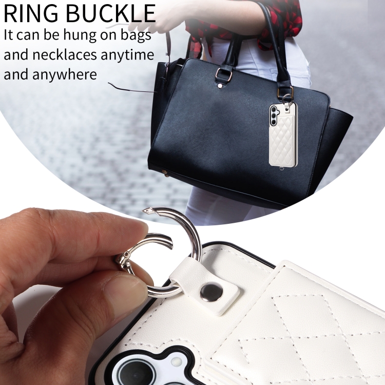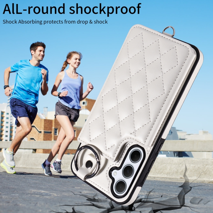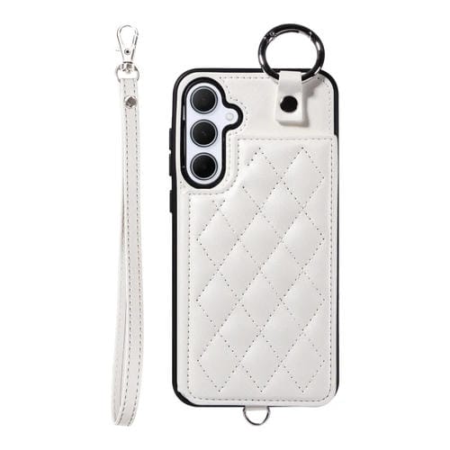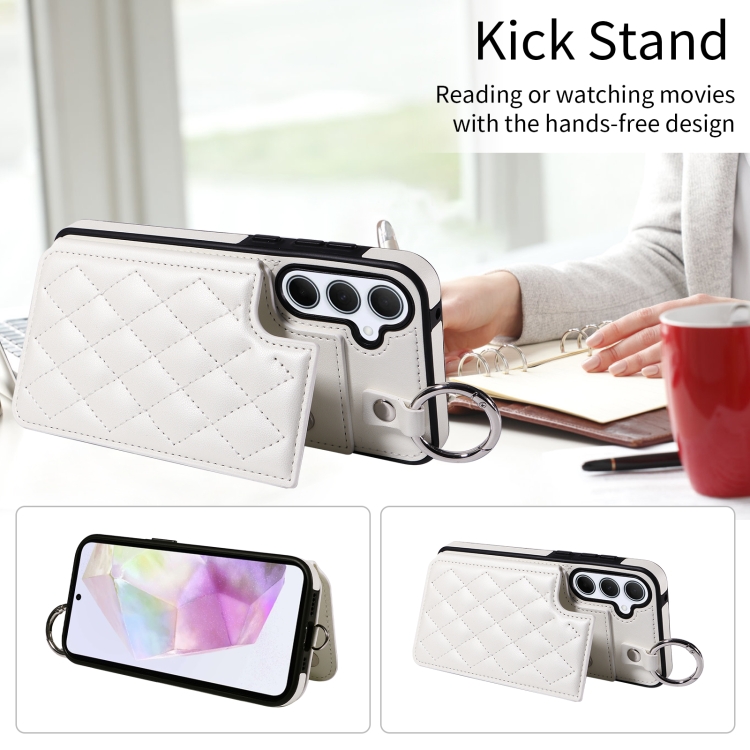 Estuche para Teléfono Samsung Galaxy A35 5G con Bolsa para Tarjetas Textura Rómbica y Cordón Corto (Blanco)