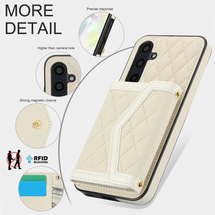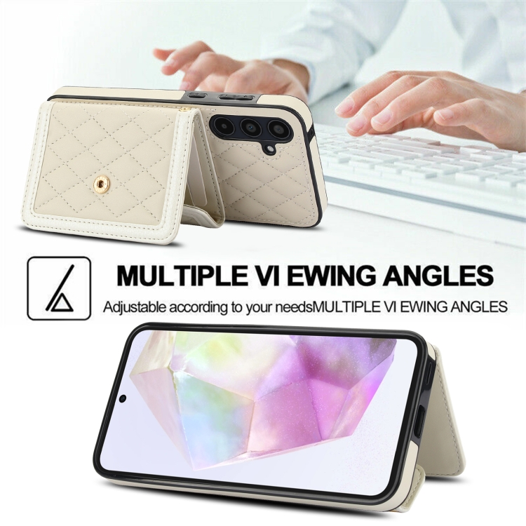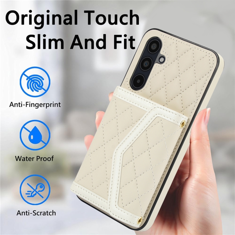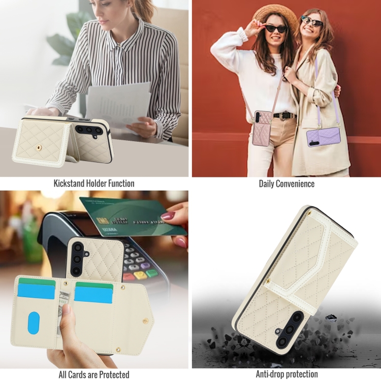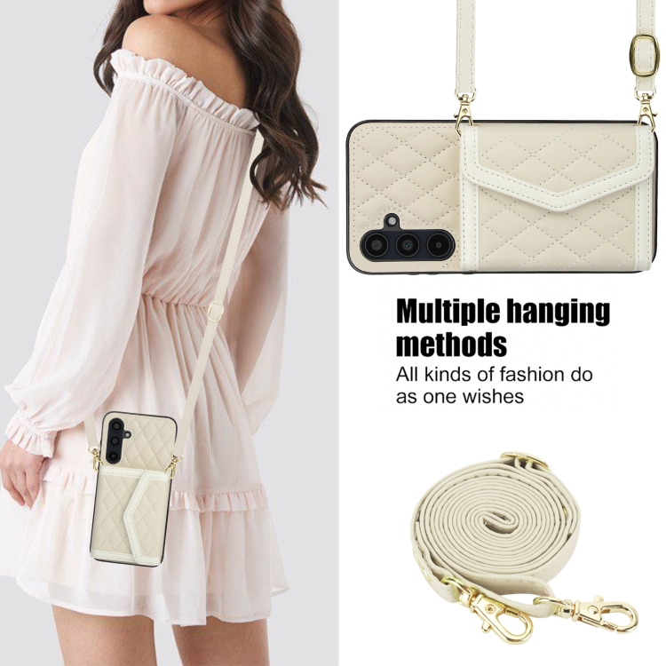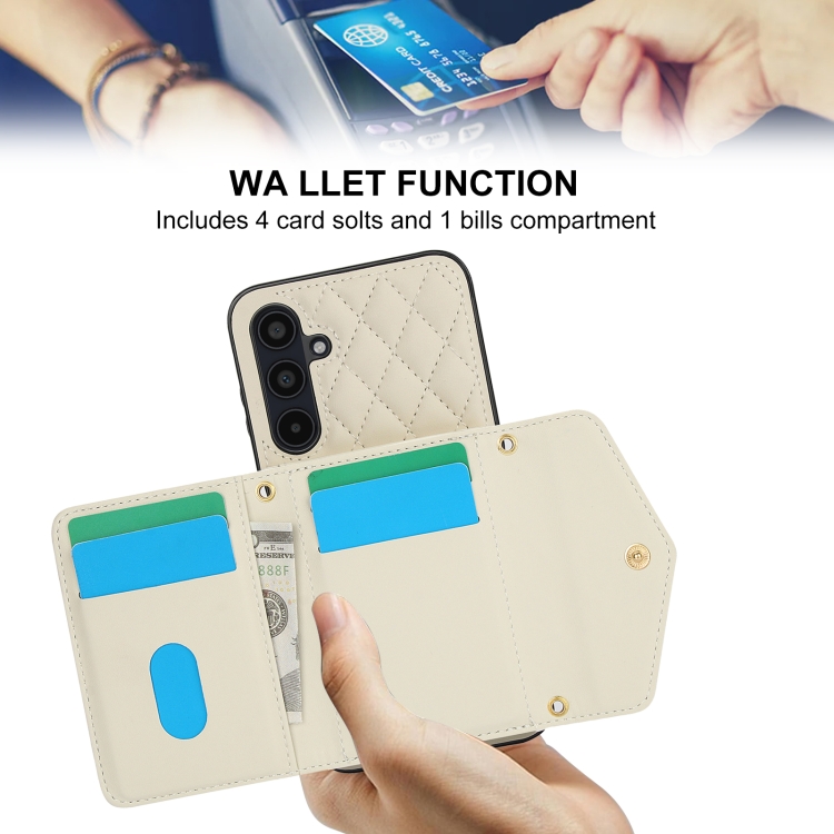 Estuche para Teléfono Samsung Galaxy A35 5G con Bolsa para Tarjetas Textura Rómbica y Cordón Largo (Beige)