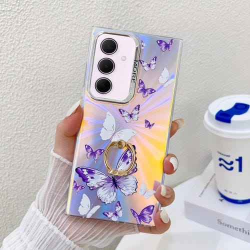 Estuche para Teléfono Samsung Galaxy A35 5G con Soporte Anillo Mariposa Láser Galvanoplastia (Morado Blanco)