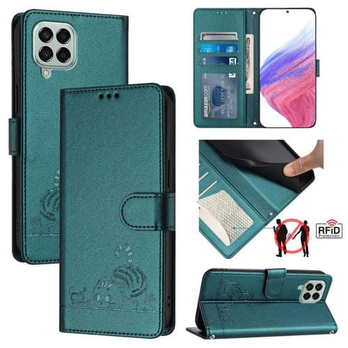 Estuche para teléfono Samsung Galaxy M33 5G Global Cat Rat Cuero Rfid Patrón en Relieve Cordón (Verde Pavo Real)