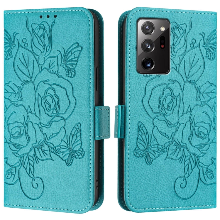 Estuche para Teléfono Samsung Galaxy Note20 Ultra Cuero Antirrobo Rfid con Rosa En Relieve (Azul Claro)