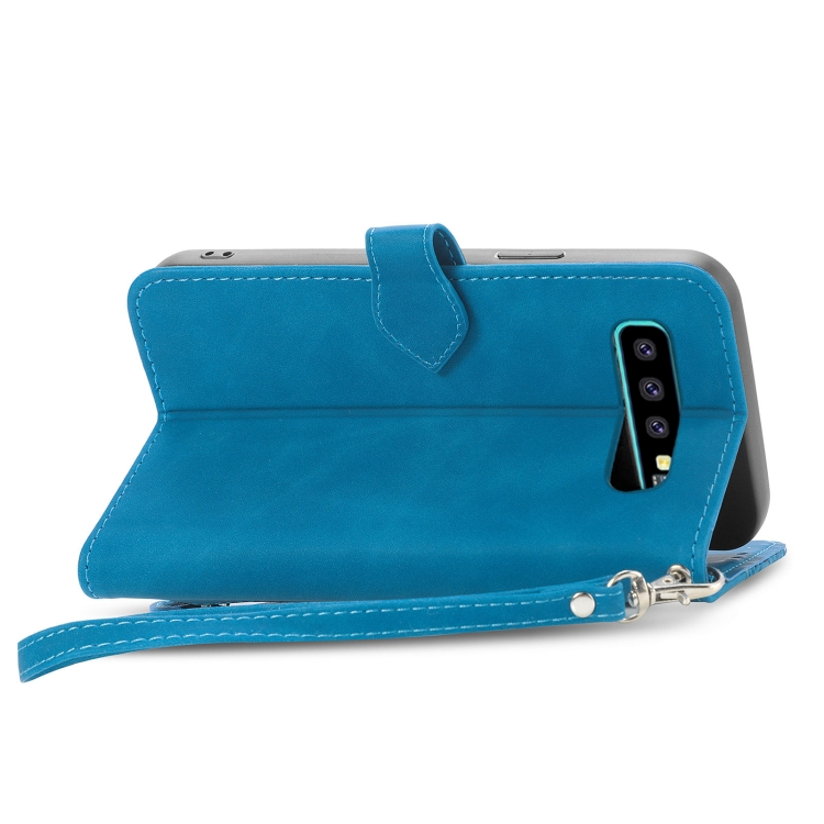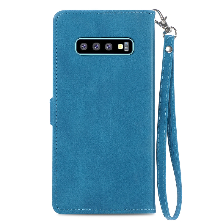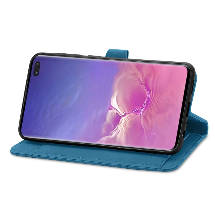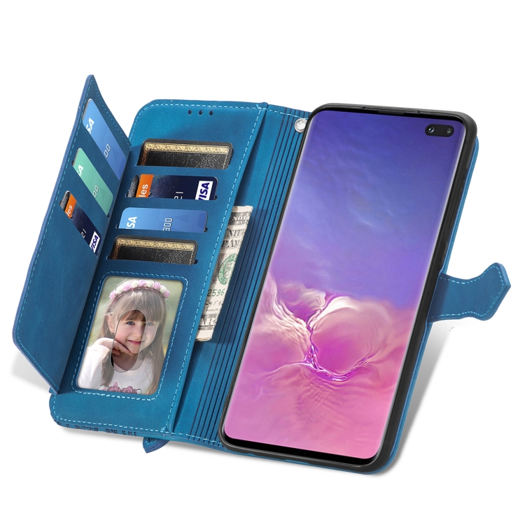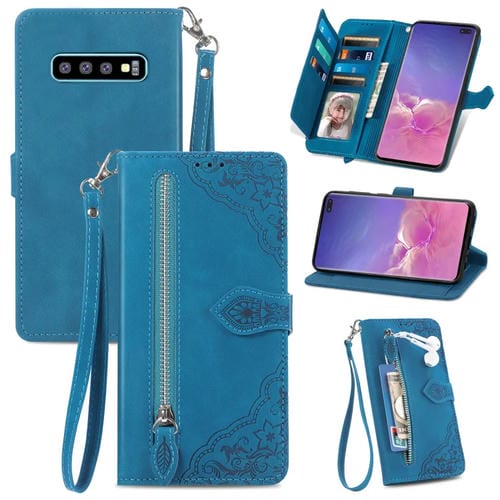 Funda de Cuero para Samsung Galaxy S10 con Cremallera y Flores en Relieve (Azul)