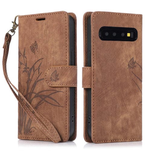 Funda para Samsung Galaxy S10 Cuero con Relieve Mariposa Orquídea (Marrón)