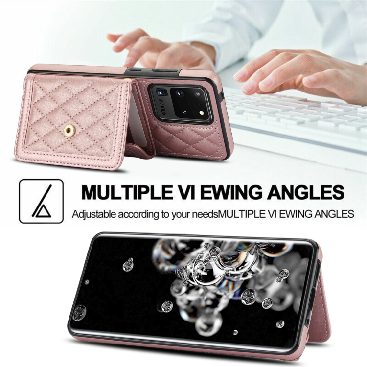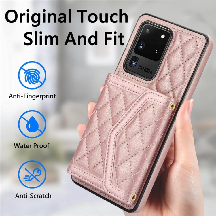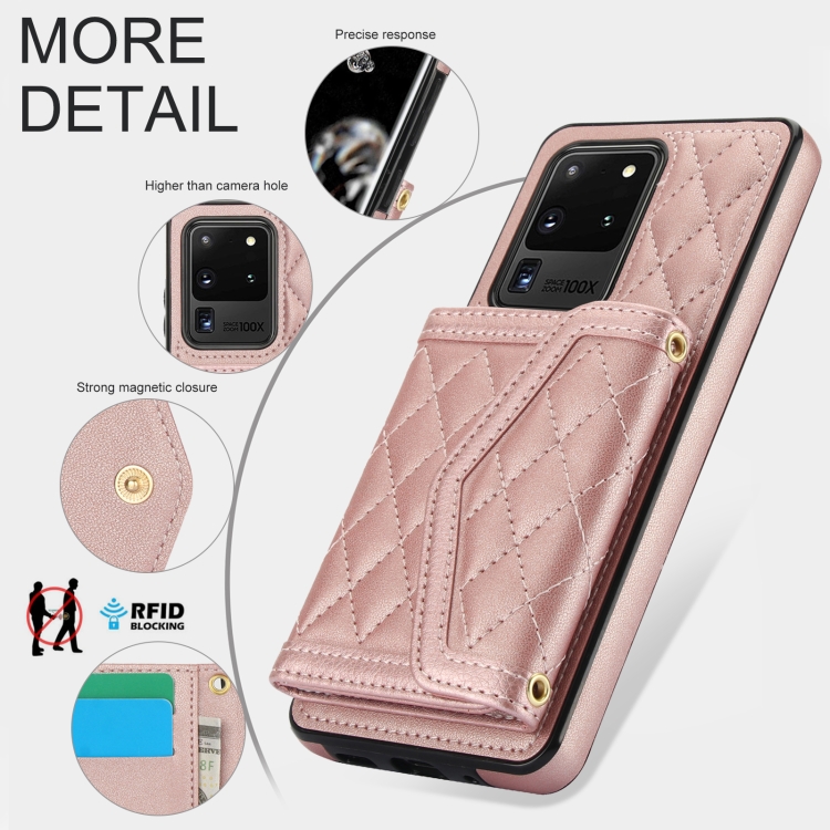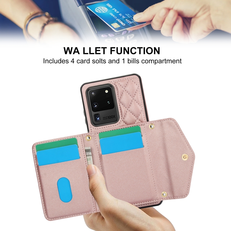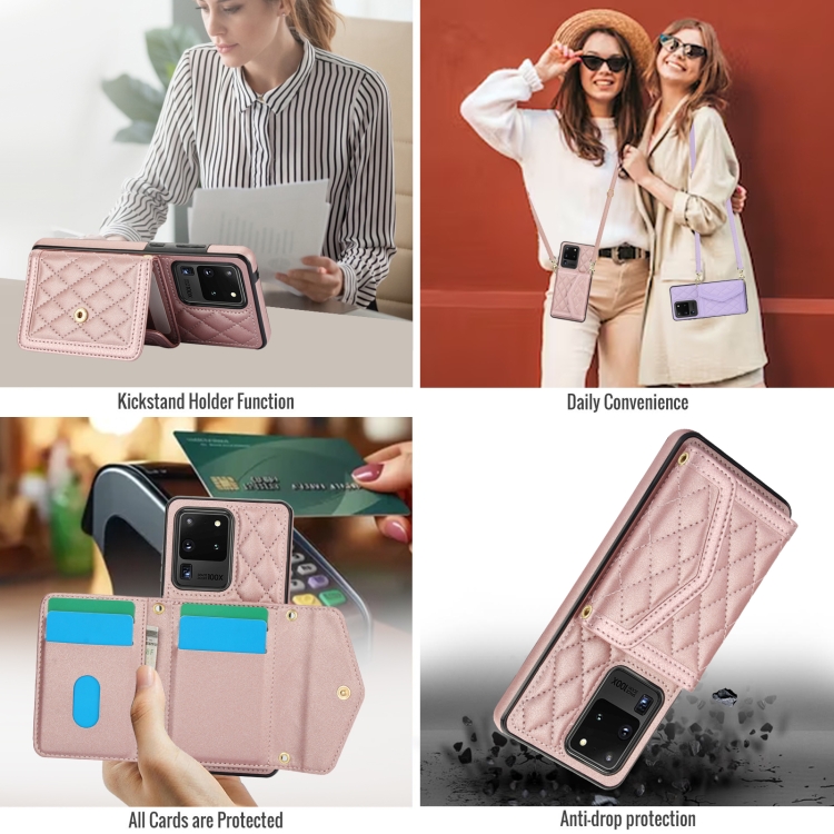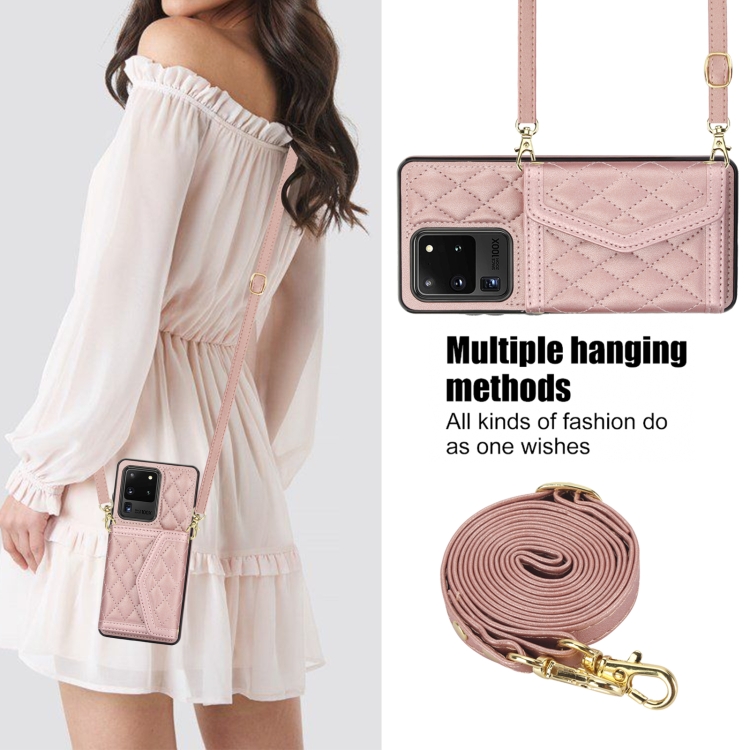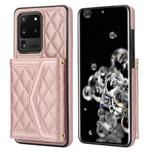 Estuche para teléfono Samsung Galaxy S20 Ultra Empalme Textura Rómbica Bolsa para Tarjetas Cordón Largo (Oro Rosa)